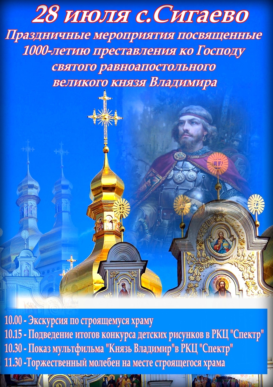 28 июля 2015 года, в селе Сигаево Сарапульского района, пройдут торжества посвященные 1000-летию преставления святого равноапостольного князя Владимира. Читать далее