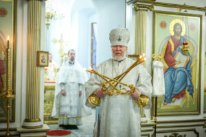 Его Преосвященству за богослужением сослужили клирики кафедрального храма: священник Николай Талалаев и диакон Николай Вайсбекер.