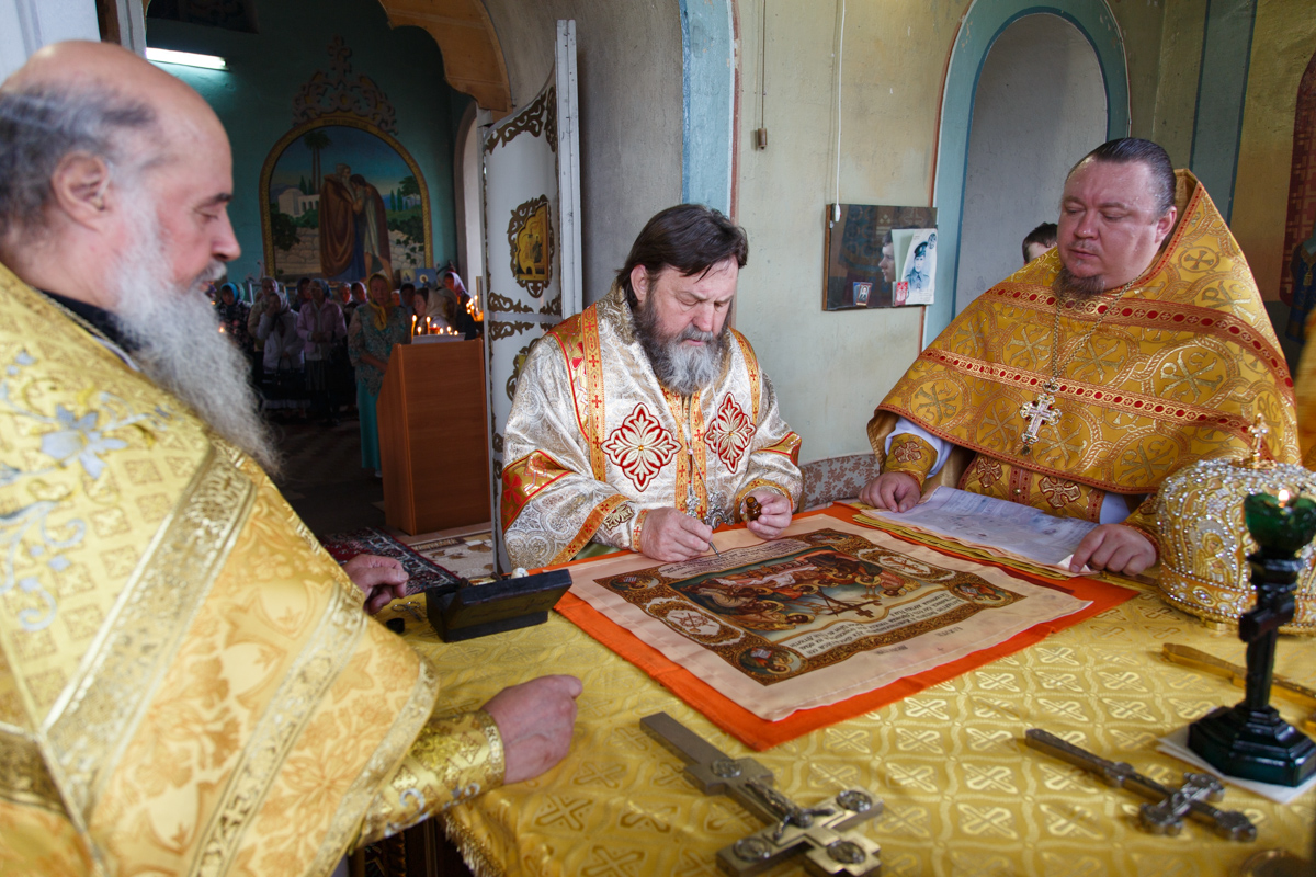 По окончании богослужения правящего архиерея приветствовал настоятель храма протоиерей Николай Сапожников, который поблагодарил Владыку за посещение храма и преподнес архипастырю букет цветов.