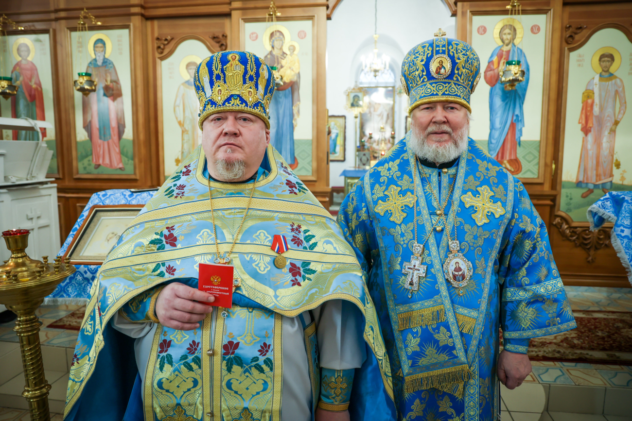 Владыка поздравил архимандрита Вениамина (Крюкова) с 35-летием священнического служения и в знак признательности за многолетние добросовестные труды во славу Церкви вручил ему общественную награду — «Медаль за доблестный труд».