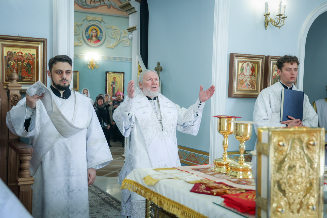 Его Преосвященству сослужили: секретарь епархии, настоятель собора священник Димитрий Сырчин, а также духовенство собора.