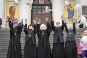 После литургии по многолетней традиции в небо были выпущены белые голуби — символ благой вести, принесенной Архангелом Гавриилом Деве Марии.