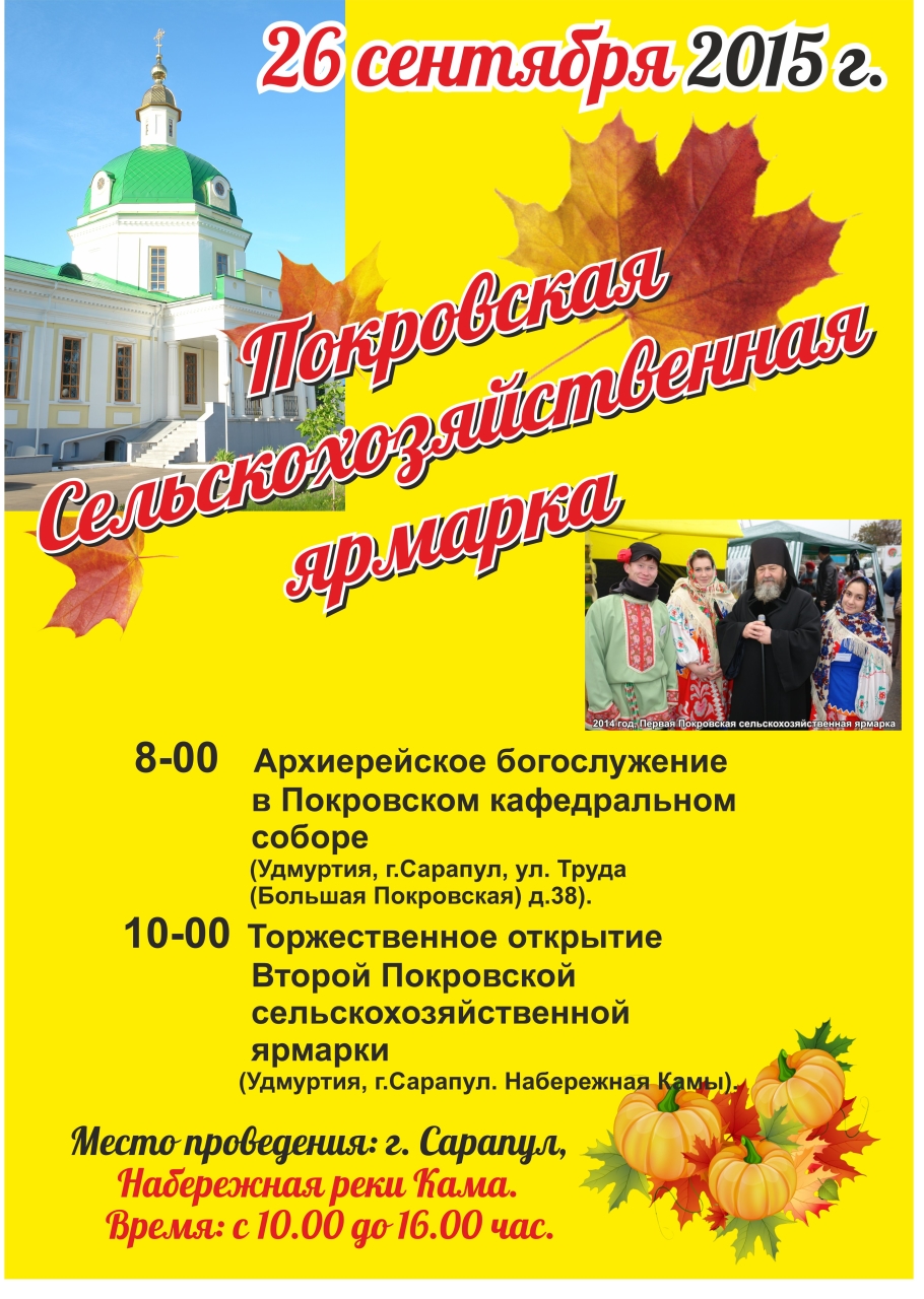 Сарапул Покровская ярмарка афиша 2015 Опубликовано 11.09.2015 910 × 1280 В Сарапуле пройдет вторая Покровская сельскохозяйственная ярмарка ← Пред. Просмотров (14)