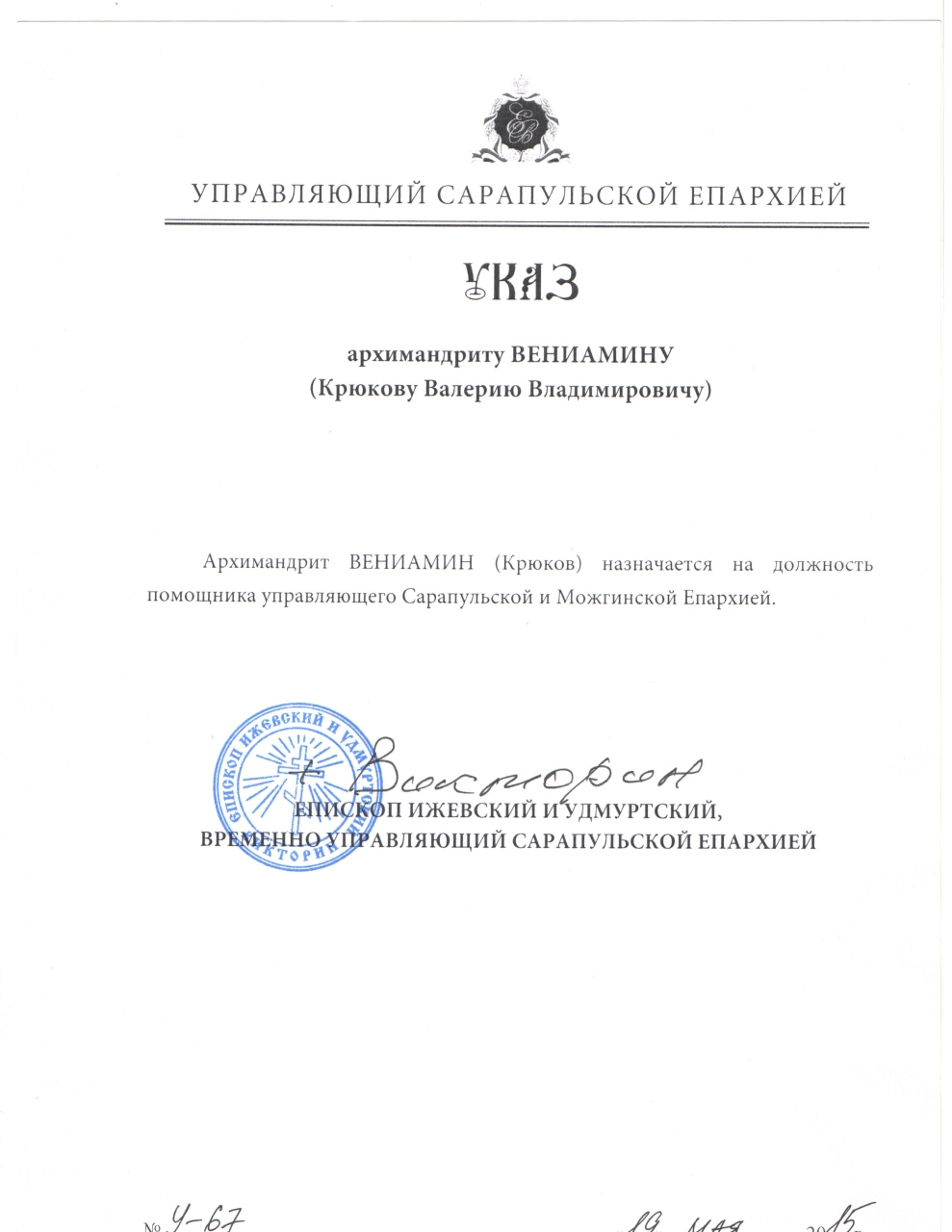 19 мая 2015 года, указом Преосвященнейшего Викторина, епископа Ижевского и Удмуртского, временно управляющего Сарапульской и Можгинской епархией, архимандрит Вениамин (Крюков), назначен на должность помощника управляющего Сарапульской и Можгинской епархией.